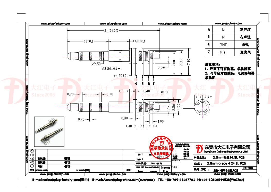 產品說明:PCB插頭 2.5mm四級24.5L PCB