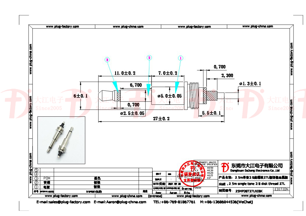 產品說明:耳機插頭-2.5單音3.8盤螺紋27L