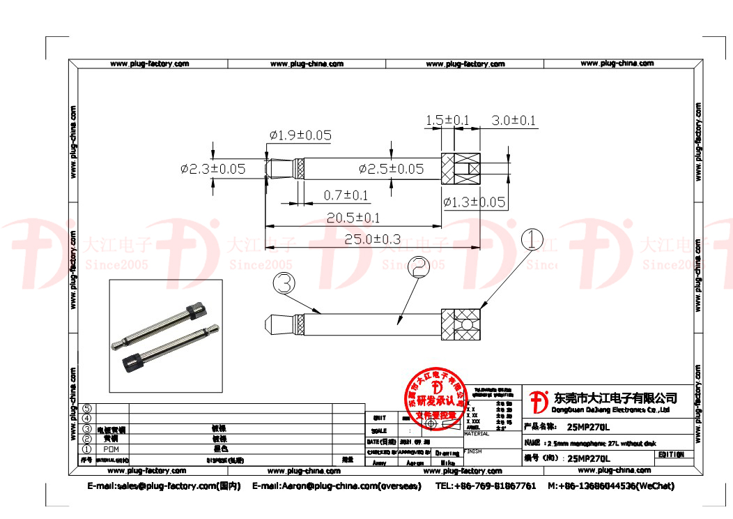 產品說明:耳機插頭-2.5單音無盤27L