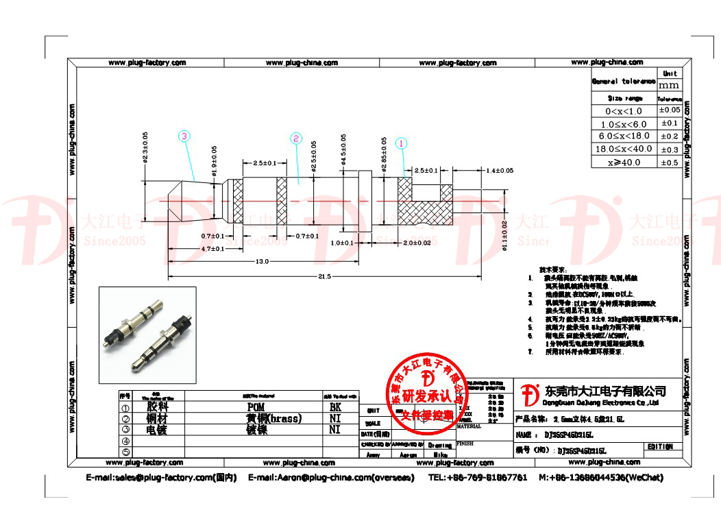 產品說明:耳機插頭-2.5立體4.5盤21.5L
