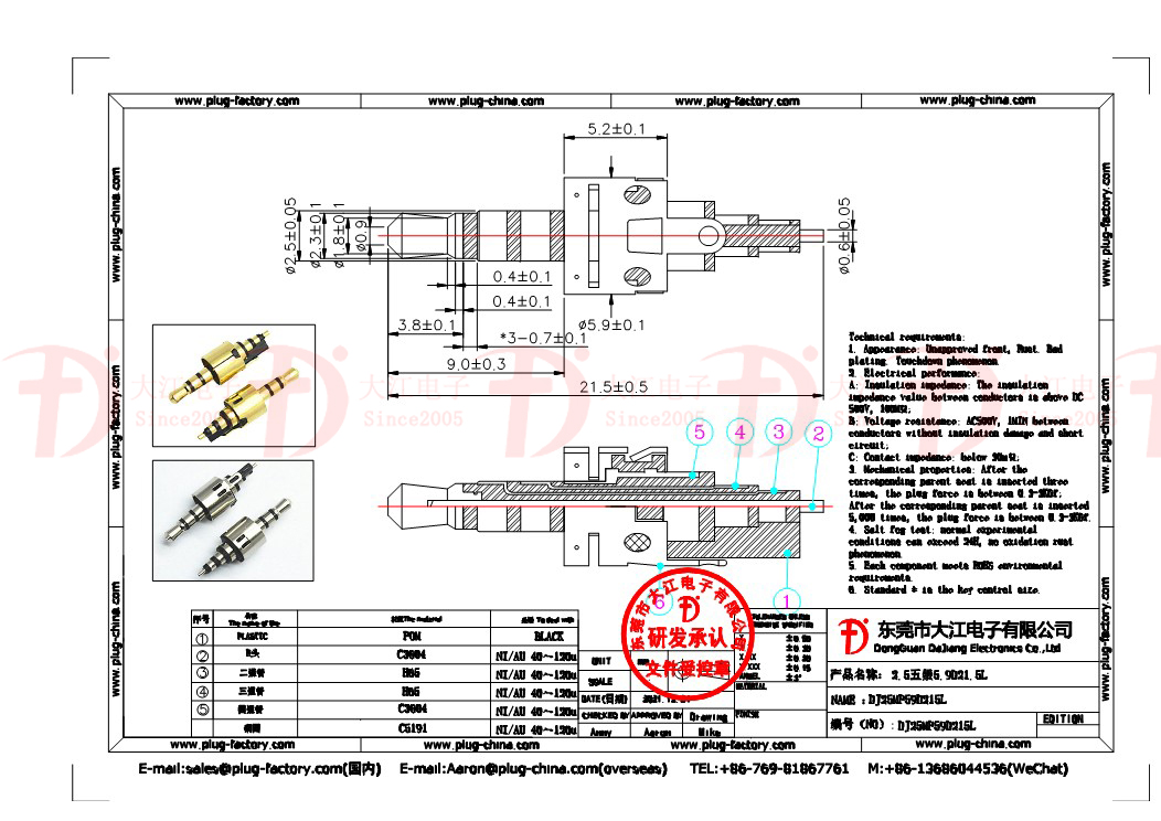 產(chǎn)品說(shuō)明:2.5mm五級(jí)6.0盤(pán) 21L鍍金黑膠 耳機(jī)插頭