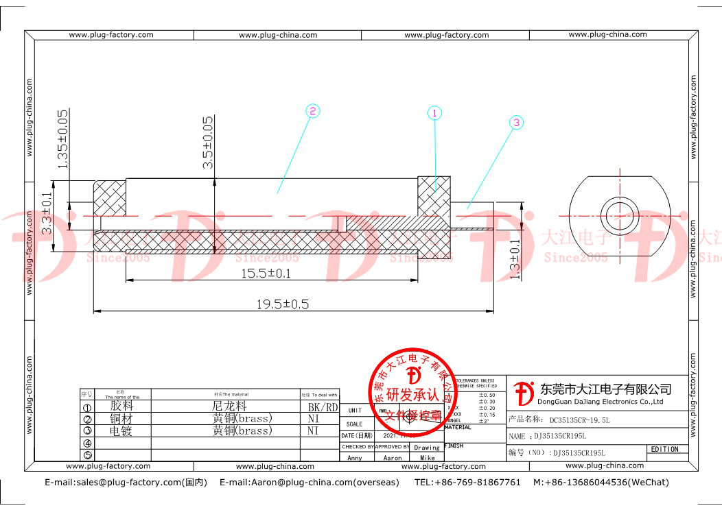 產品說明:DC插頭-35135CR平口 20.5L鍍鎳紅膠  環保插頭
