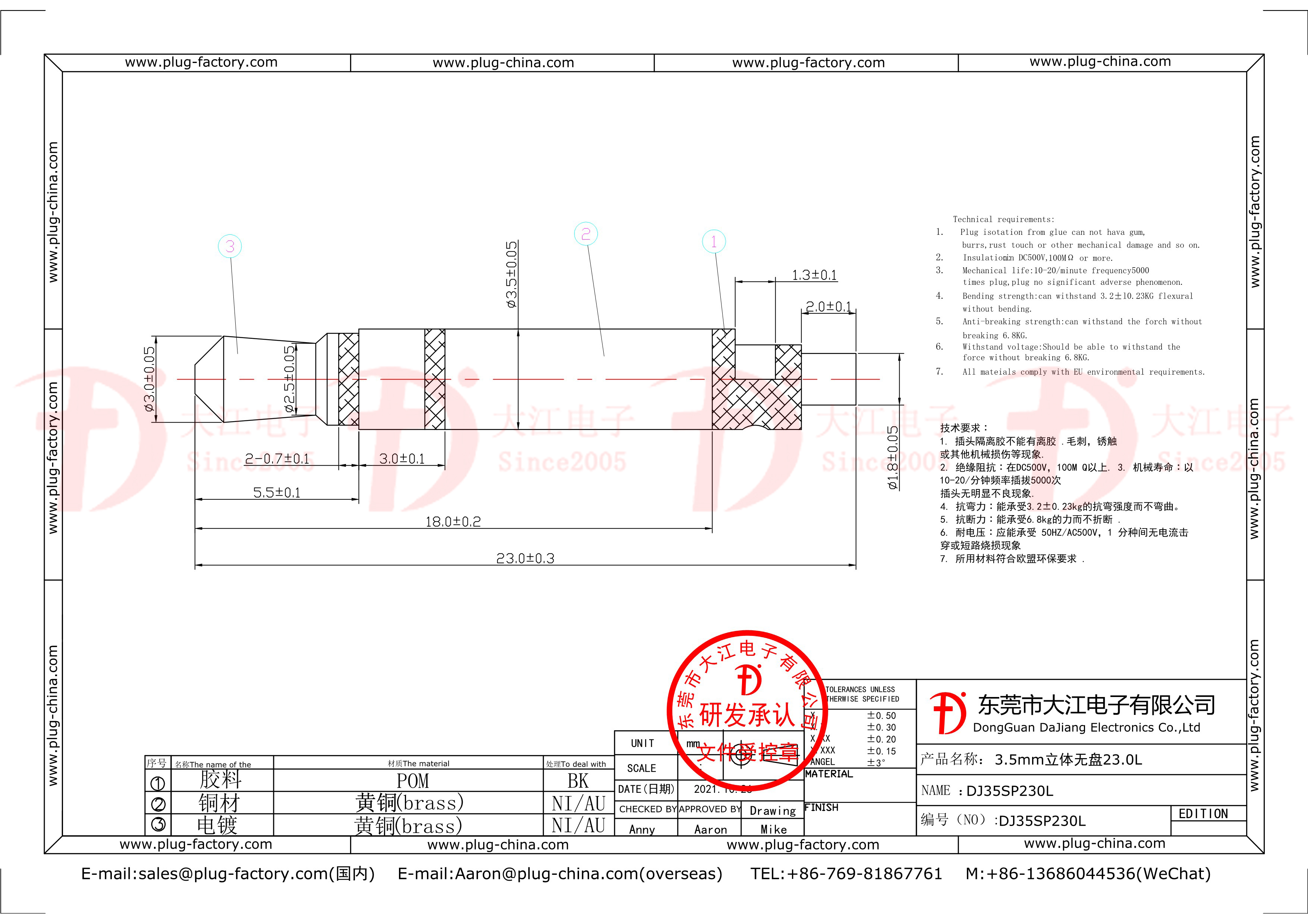 產(chǎn)品說(shuō)明:耳機(jī)插頭-3.5mm立體無(wú)盤23.0L 鍍金