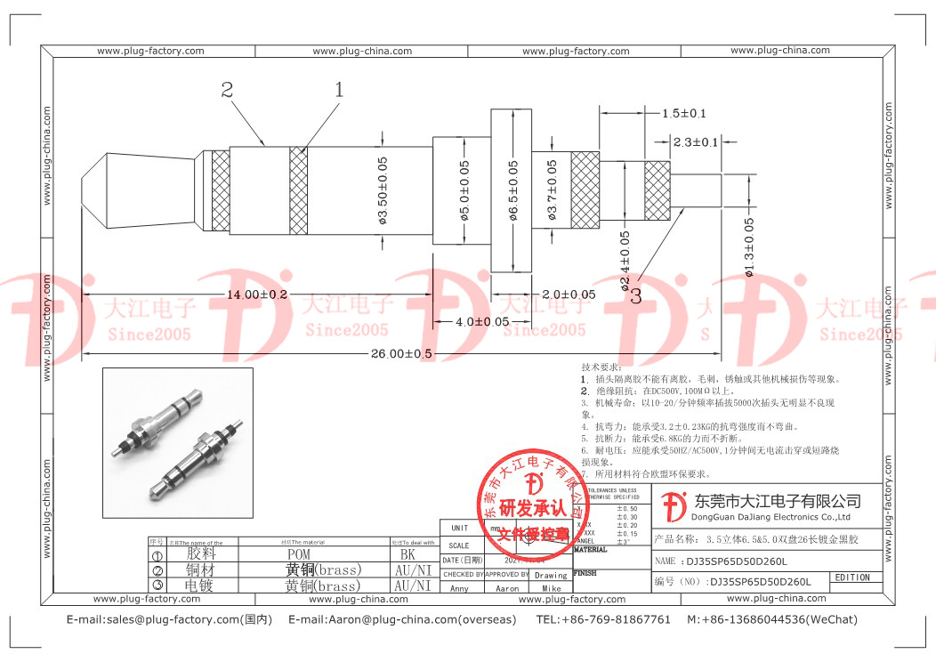 產品說明:耳機插頭 3.5mm立體6.5&5.0雙盤26L ??