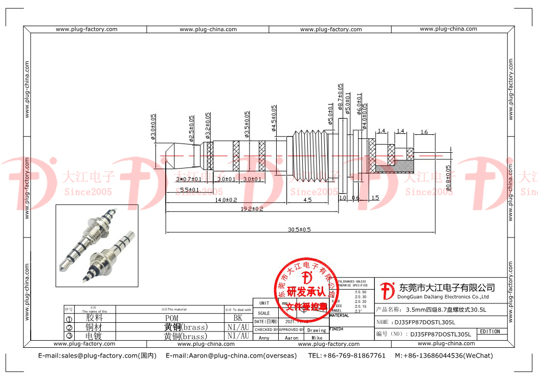 產品說明:耳機插頭--3.5mm四級8.7盤螺紋式 30.5L