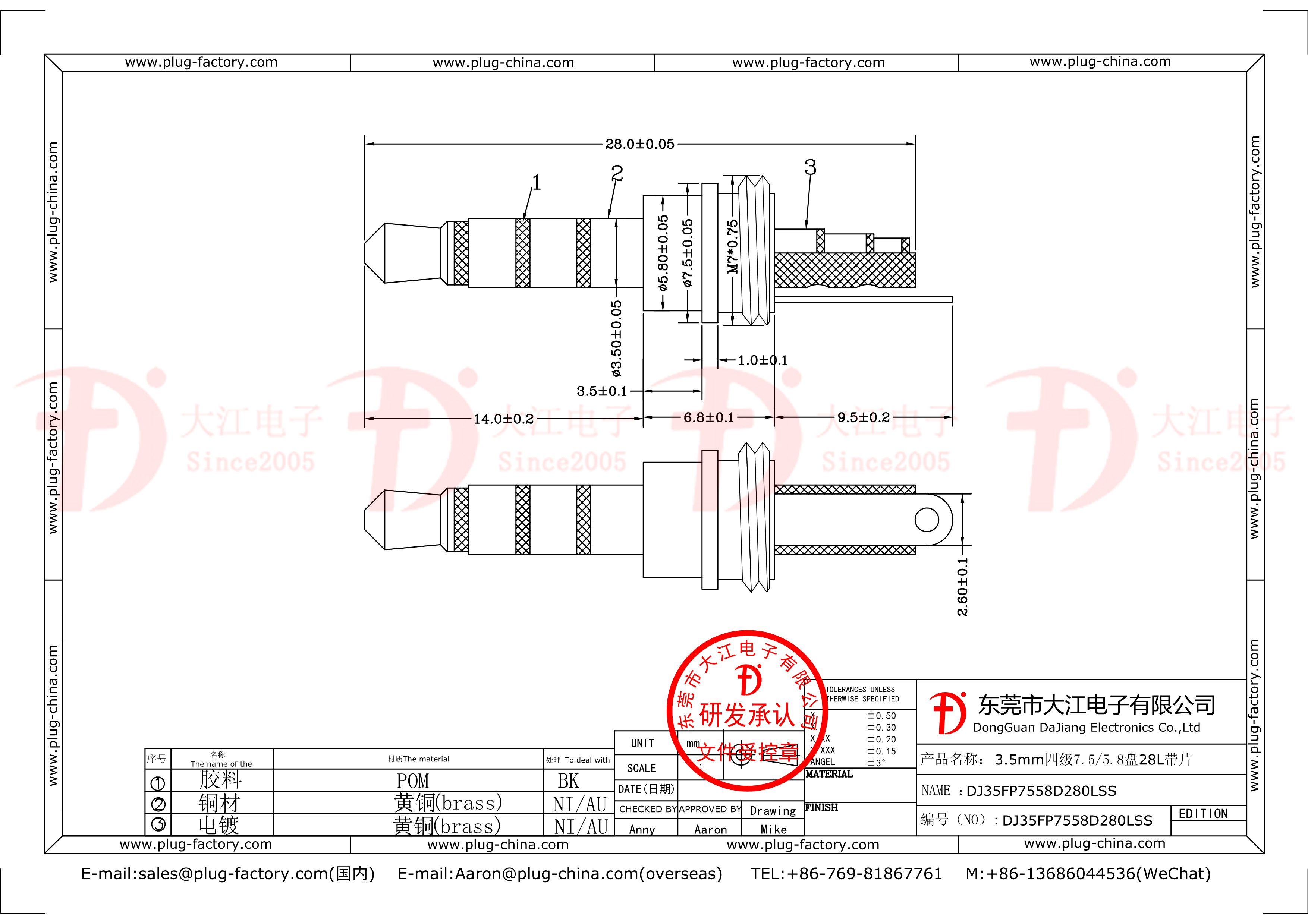 產品說明:耳機插頭3.5四級7.5/5.8盤 28L鍍金帶片 定制低鉛過加州65