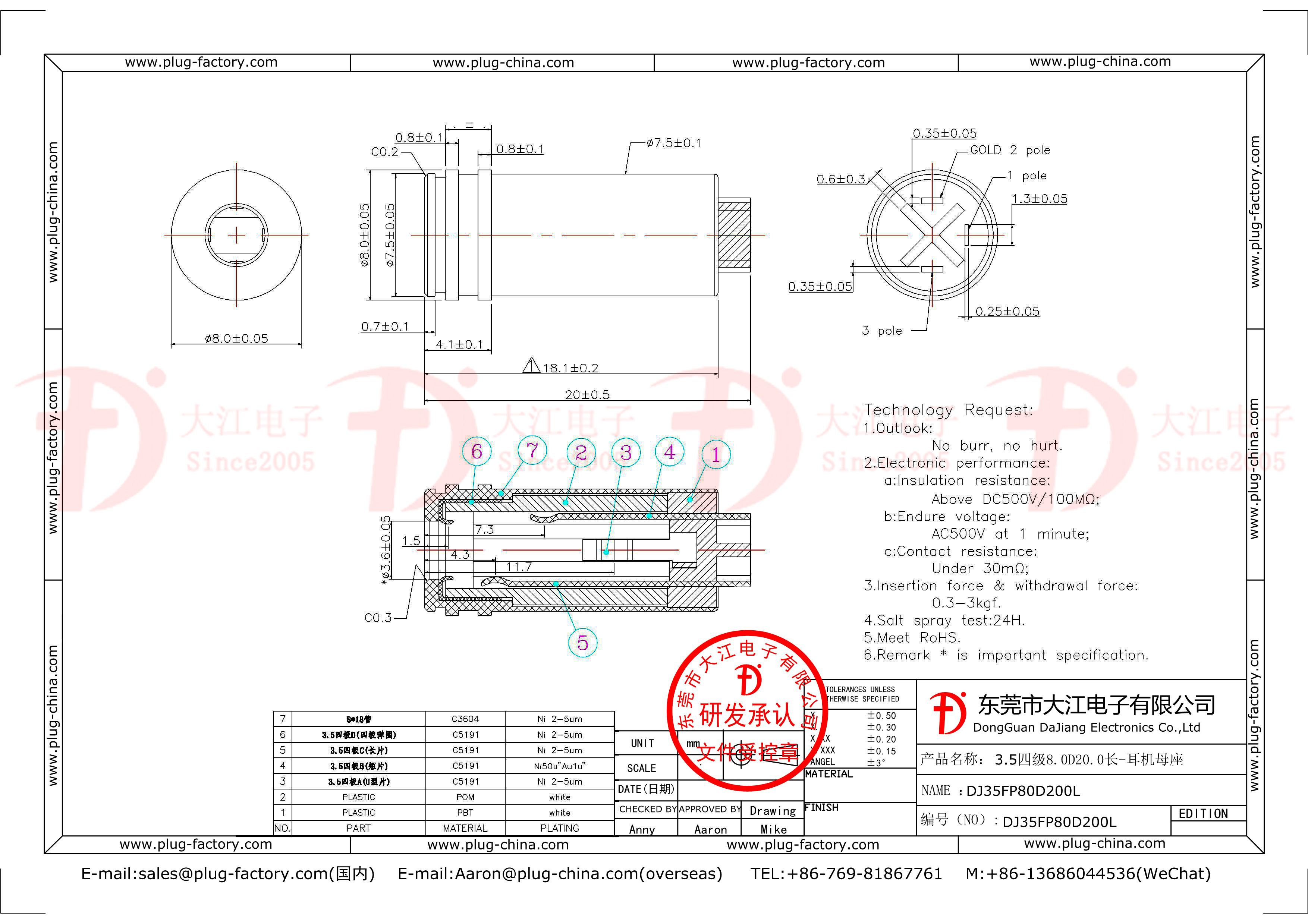 產(chǎn)品說明:耳機母座-3.5mm四級8.0D 鍍鎳 20.0L