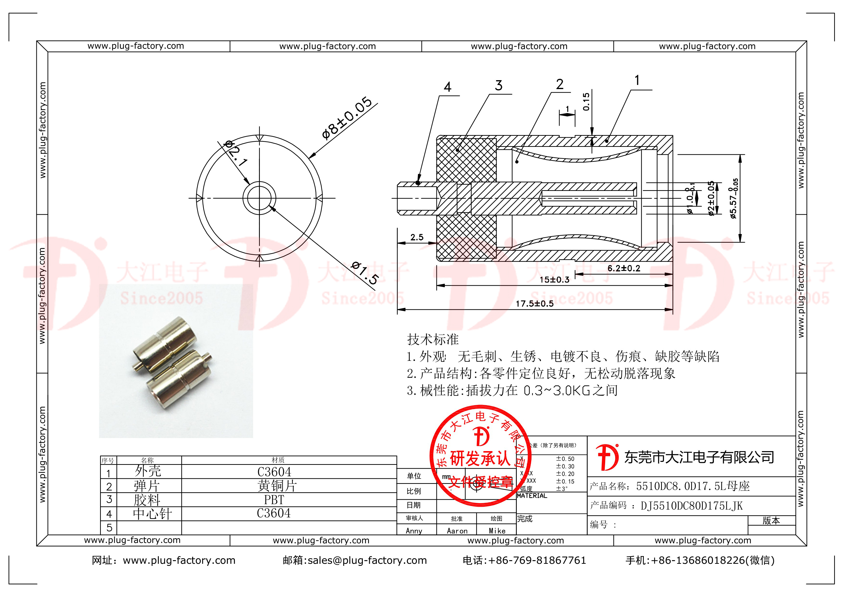 產品說明:5510母座8.0D17.5L