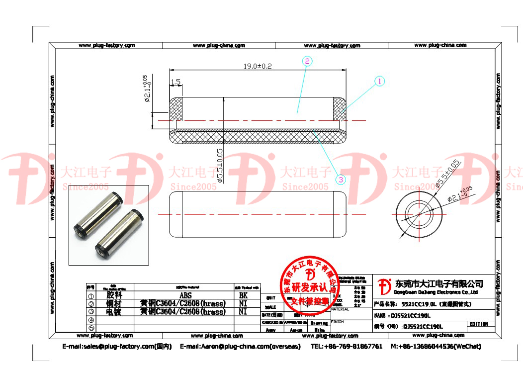 產(chǎn)品描述:OD=5.5mm,ID=2.1mm,L=19.0mm;黑膠及其它顏色,鍍層為鍍鎳.