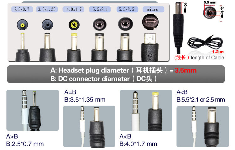 5.5*2.1(DC5521):目前使用最廣泛的DC圓頭接口。監控攝像頭、部分機頂盒、LED臺燈、數碼家電等等。。。大多使用12v1a 或 12v2a的功率輸出。