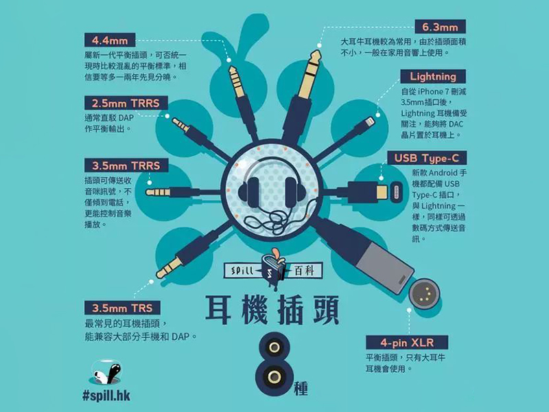 Lightning:由盛傳 iPhone 7 刪減 3.5mm 耳機插口,直至真的消失了。坊間已有不少 Lightning 耳機,顧名思義專為 iOS 裝置而設,某程度上欠缺靈活性。傳統 3.5mm 耳機插口輸出是仿真訊號,要利用手機內置的 DAC 進行譯碼,轉換成仿真訊號后才傳送至耳機上。但 Lightning 接口的耳機,能夠將 DAC 芯片置于耳機內,耳機廠商可以自行選用 DAC 譯碼芯片,確保可以發揮出耳機應有實力。