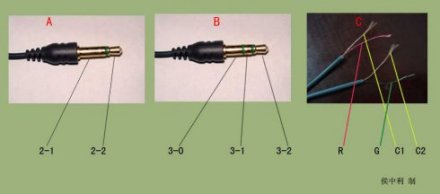 最常見的立體聲耳機分三層,也有兩層的,每一層都有對應的功能,要DIY的話一定要分層。標準分布為“左右地紅白”(從端部到根部依次是左聲道、右聲道、地線,其中左聲道常用白色線皮,右聲道常用紅色的)。一般進行耳機DIY可按如圖1連接(圖1B為常見的三層接頭),將C1(一般為黃色)和C2(同C1)擰成一股接3-0為地線,R(紅色)線為右聲道接3-1,G(綠色)線為左聲道接3-2。如果是分四層的手機帶麥克風耳機,從頂端部到根部依次是左聲道、右聲道、麥克風、地線。