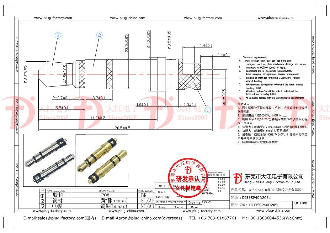 產品說明:耳機插頭-3.5立體4.0盤20.5L
