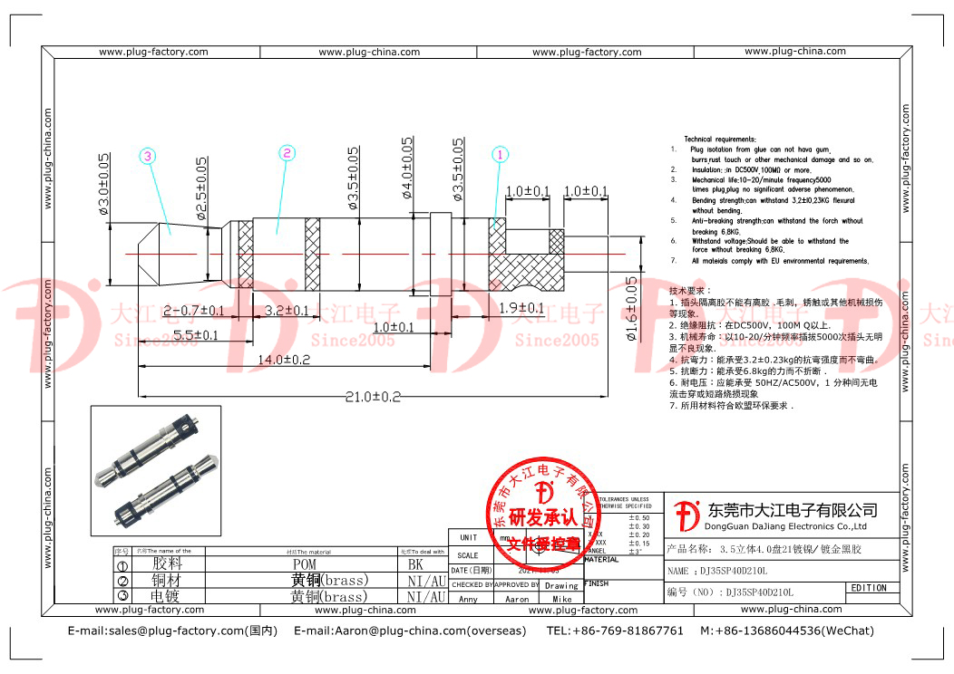 產品說明:耳機插頭-3.5立體4.0盤21.0L