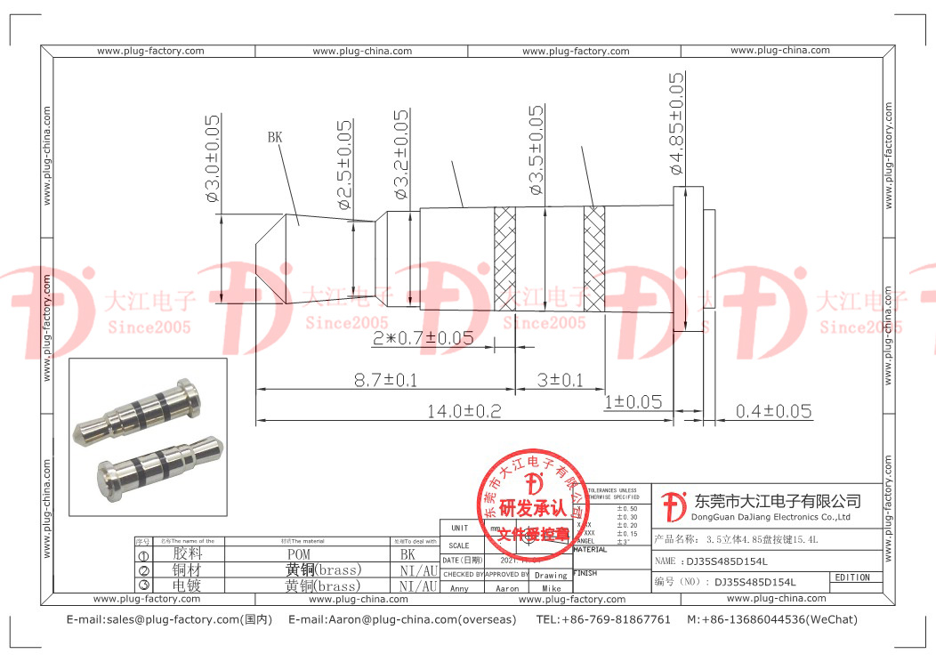 產品說明:耳機插頭-3.5立體4.85盤15.4L 按鍵