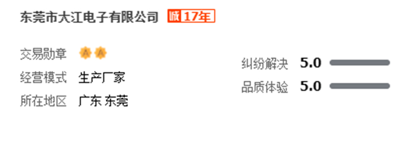 好消息!大江電子商家力,定制服務被阿里巴巴國際出口通平臺評為五星級榮譽級別?!