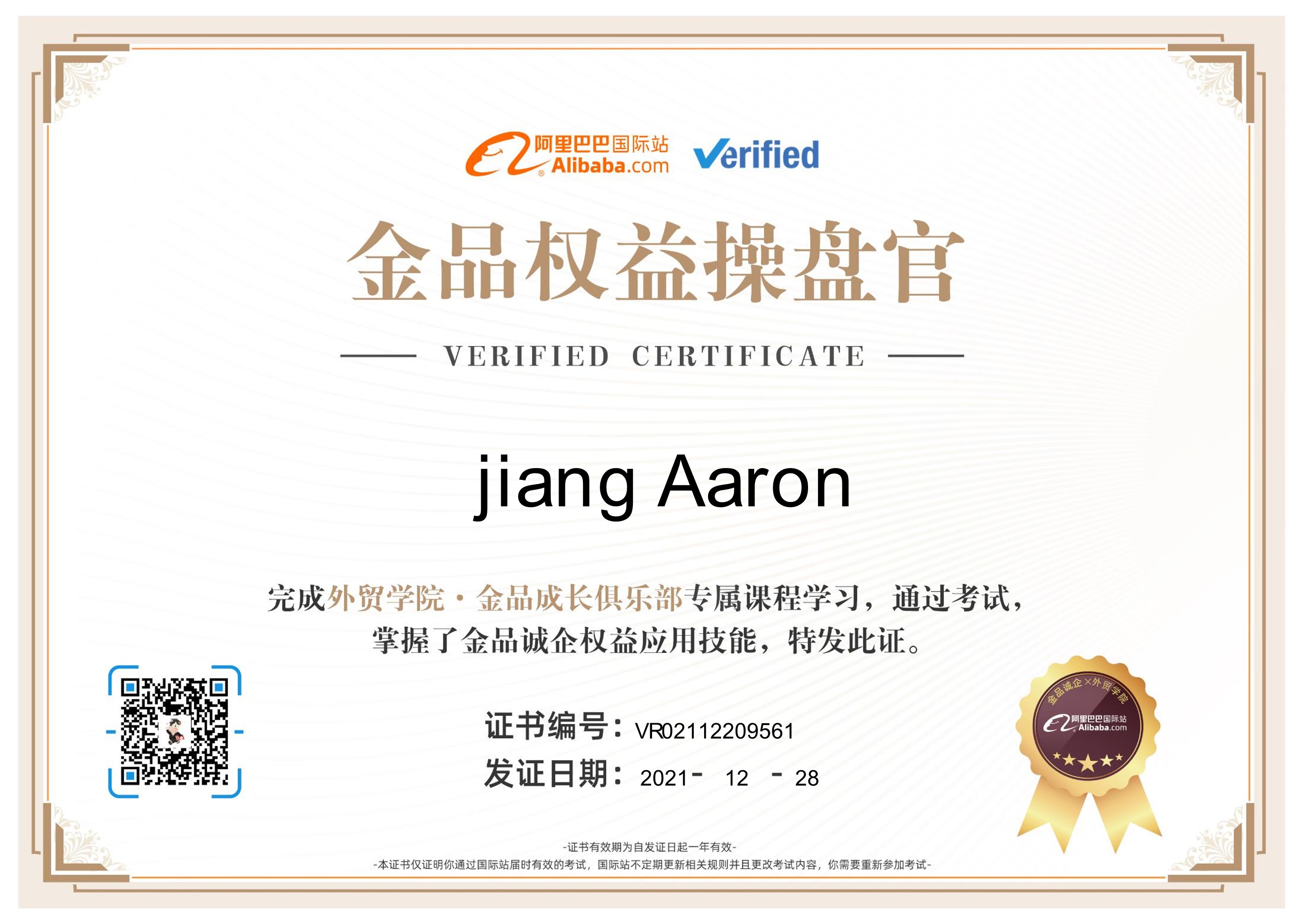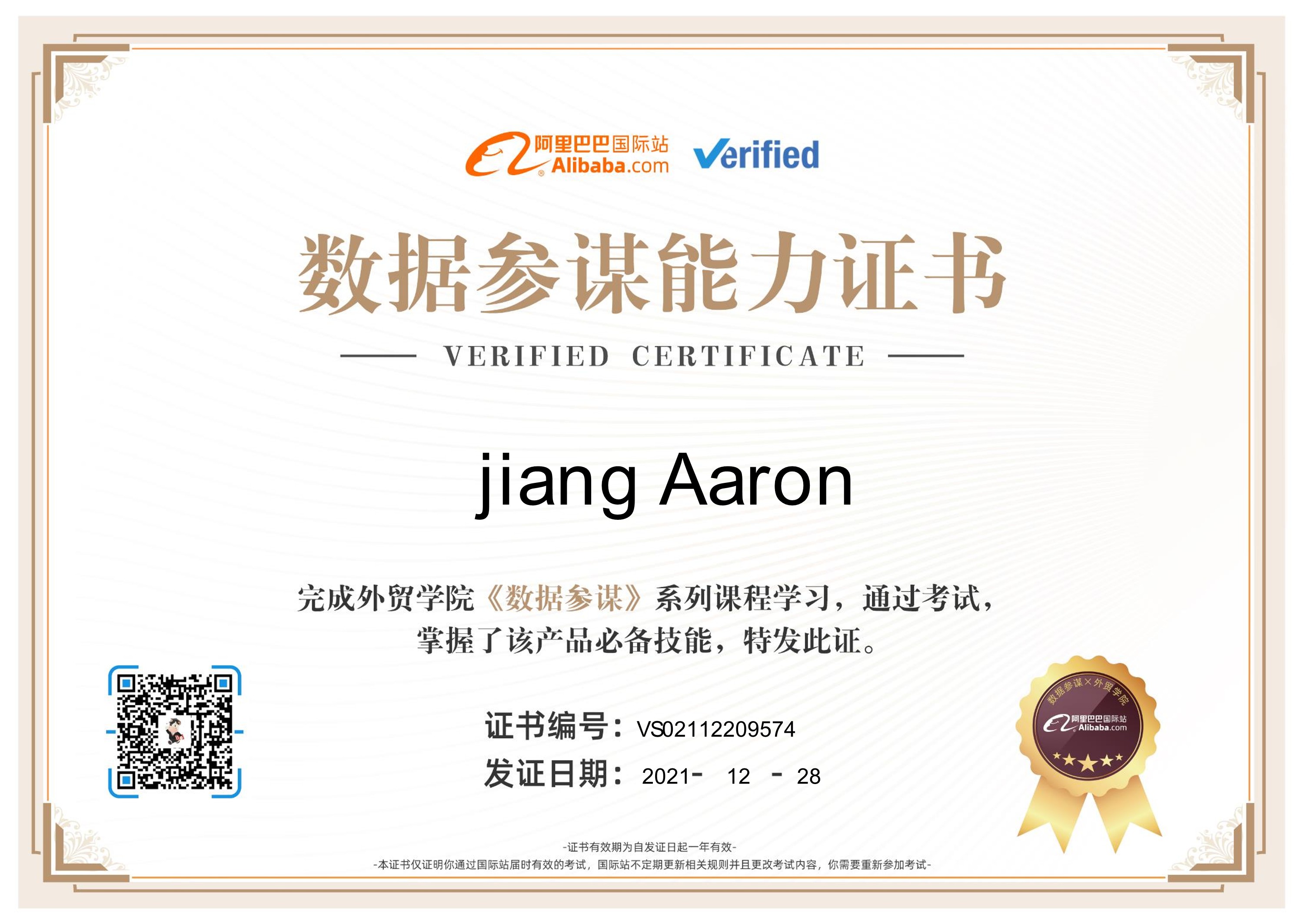 東莞市大江電子于2021.12.8日榮獲阿里國際站《金品權益操盤官》,《數據參謀能力證書》;我司得到了阿里國際站的認可,也意味著我司的實力也有所提升,也得到了認可。